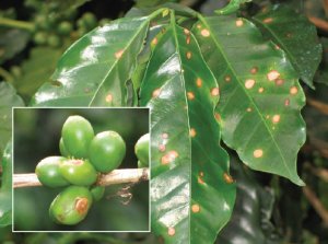 咖啡驼孢锈菌,即叶片锈病,会导致熟前落叶,显著减少来年产量;而咖啡生尾孢菌,即褐斑病,也会影响果实,使其难以出售。