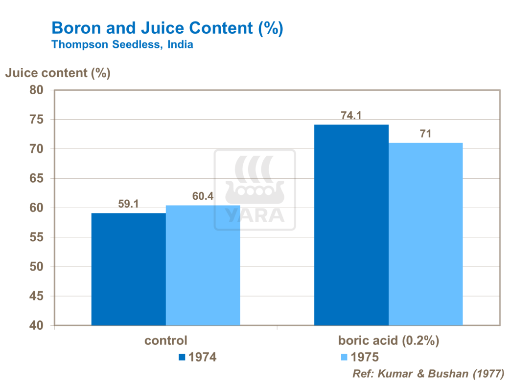 一系列含硼叶面肥的施用可以增加果汁含量。研究人员认为,硼能改善葡萄藤的生长,主要是因为硼能提高作物对氮的吸收。